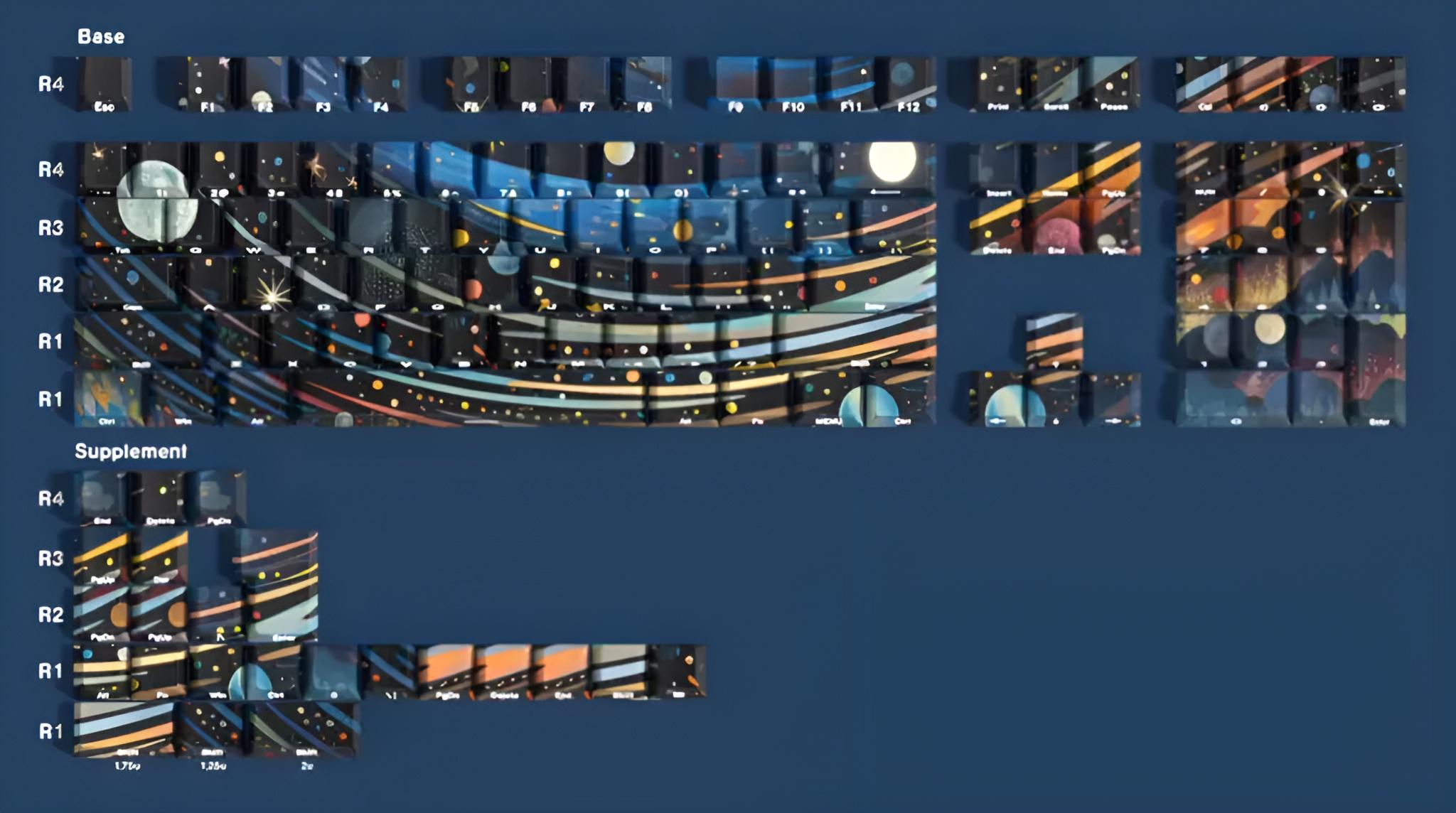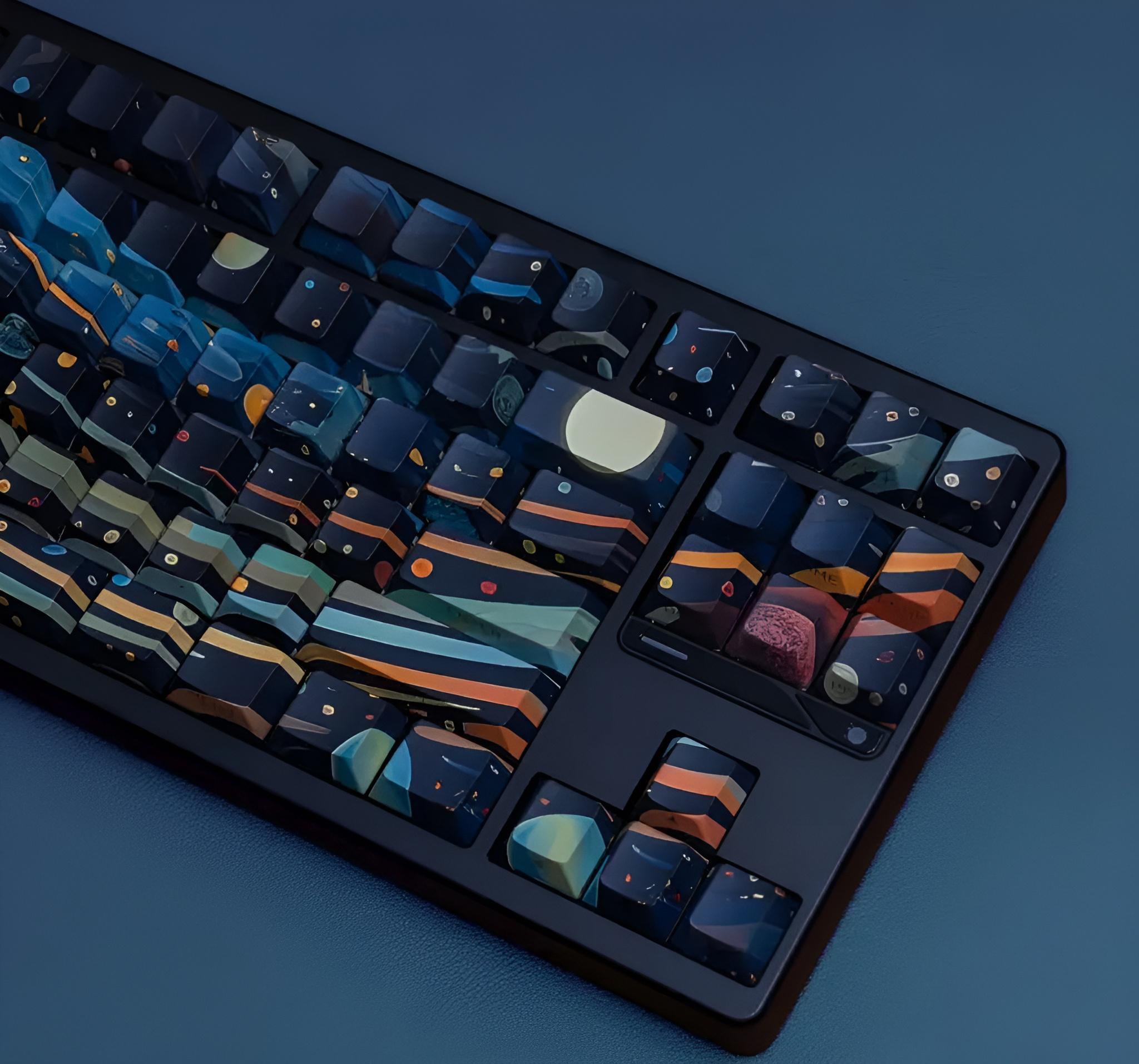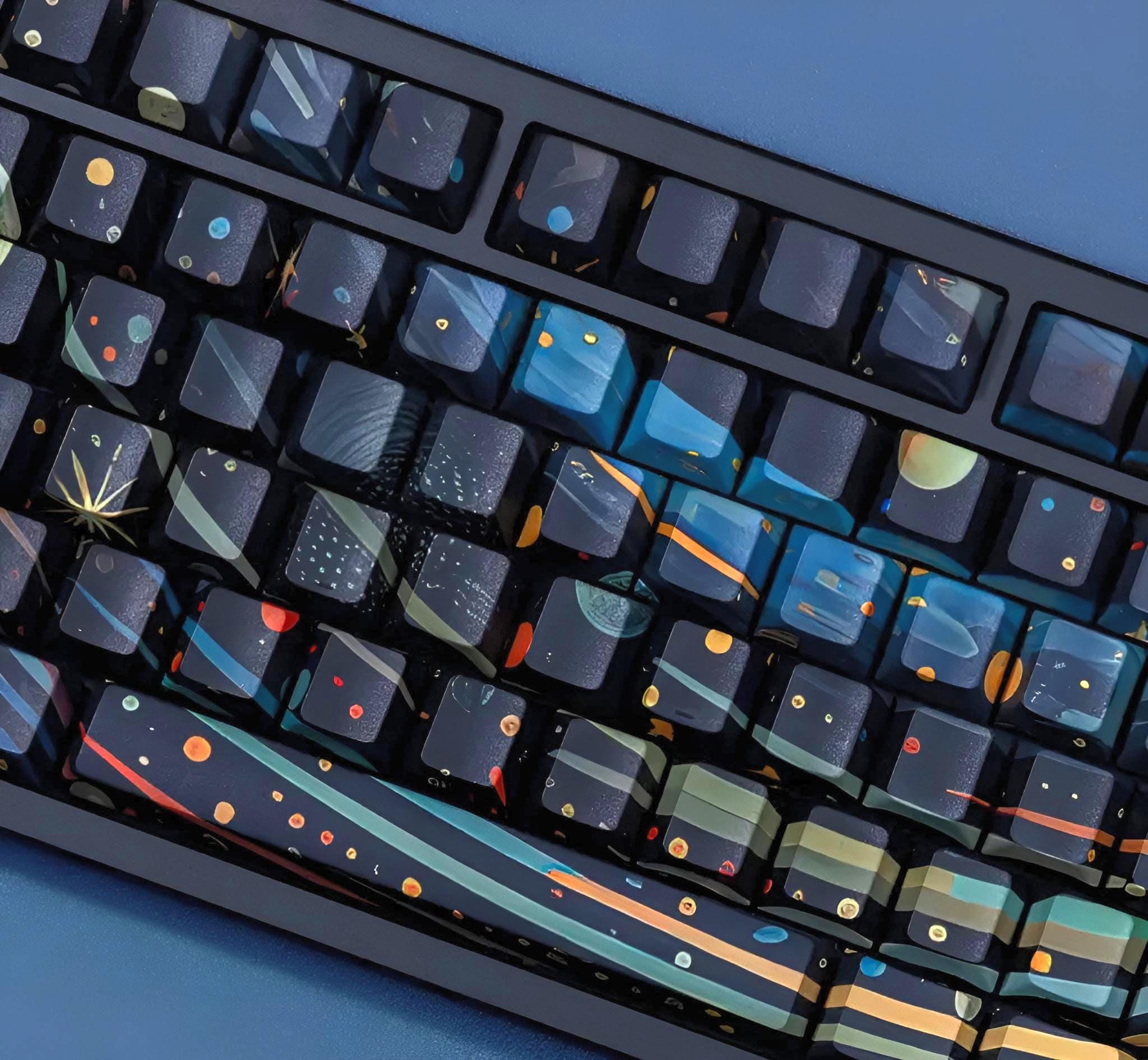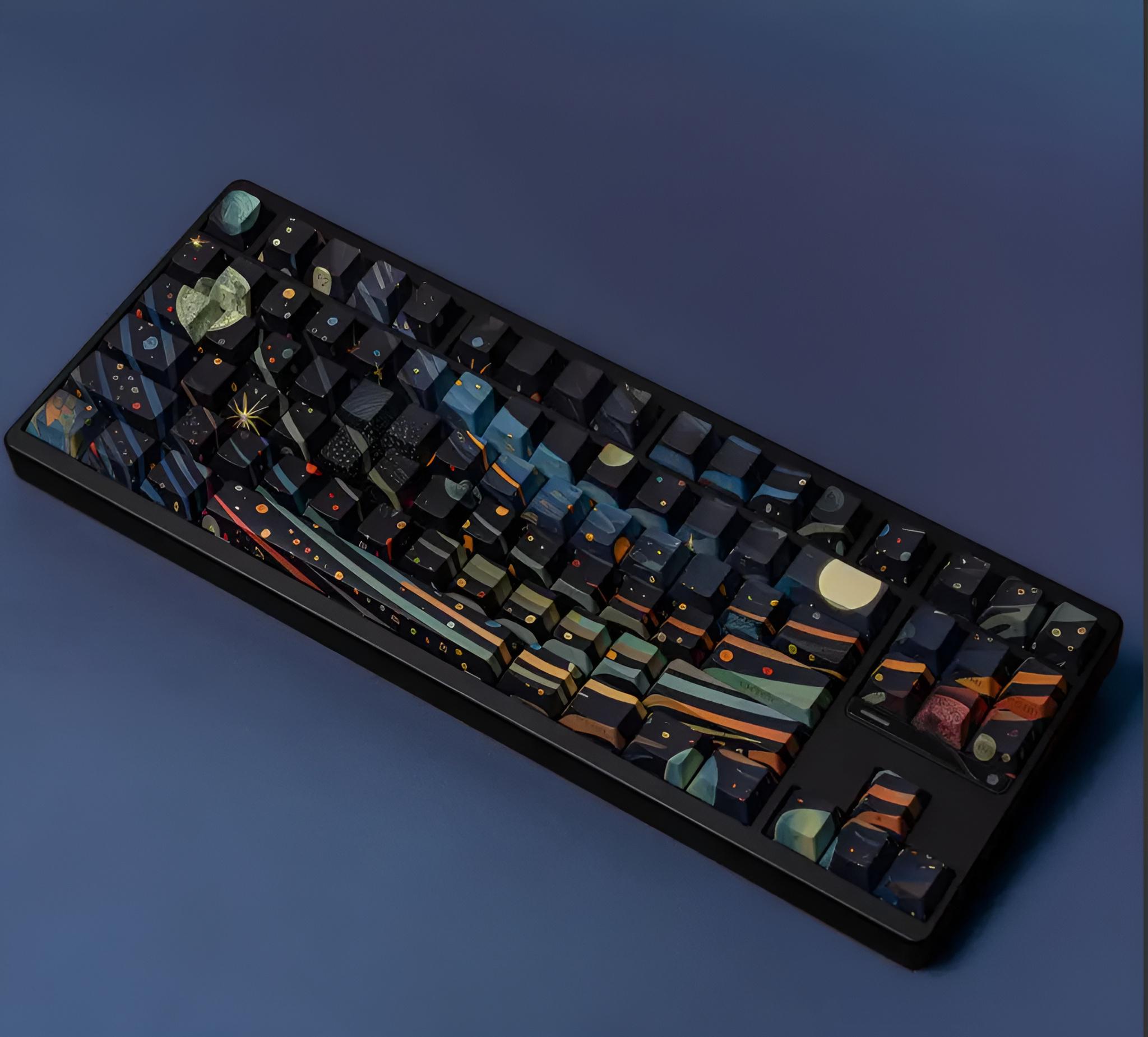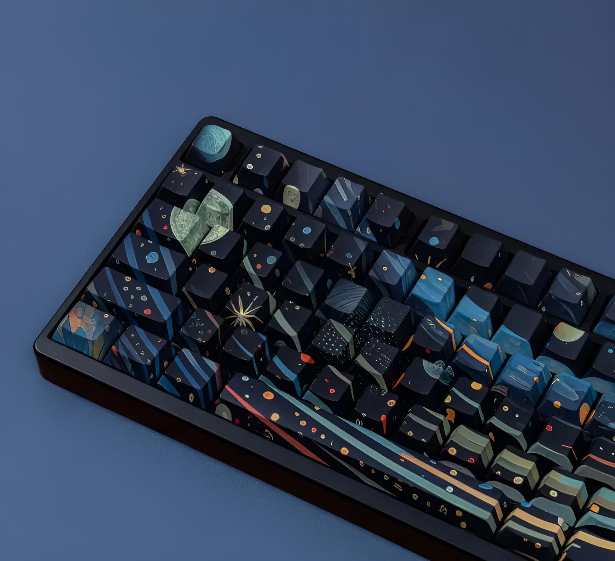 A set of 128 keycaps themed after the night sky. Features a standard 6.25U length spacebar that will fit most keyboards. Single-shot PBT but quite thick in case you like your keyboards thocky (you can see the thickness in the video). Cherry profile.