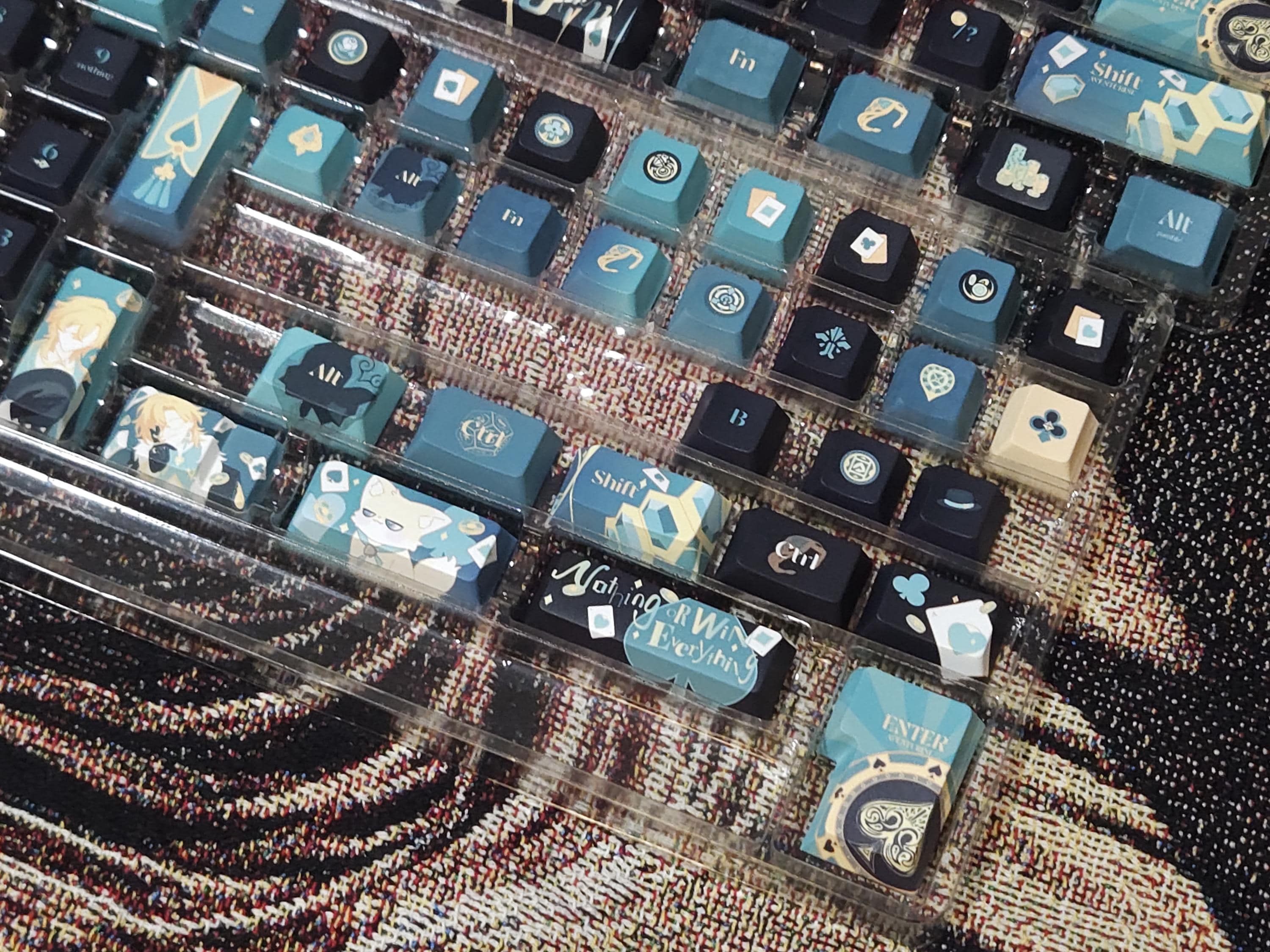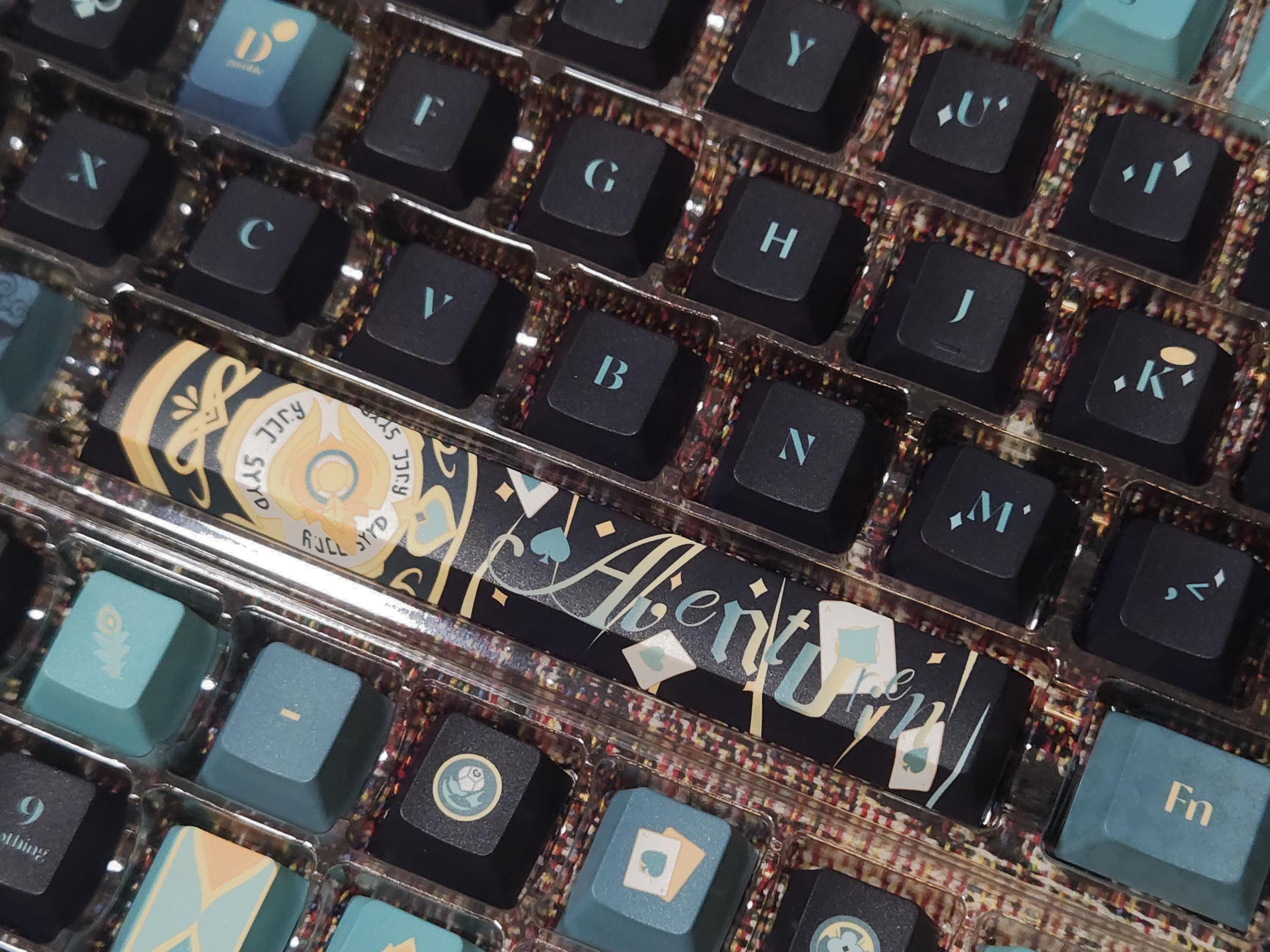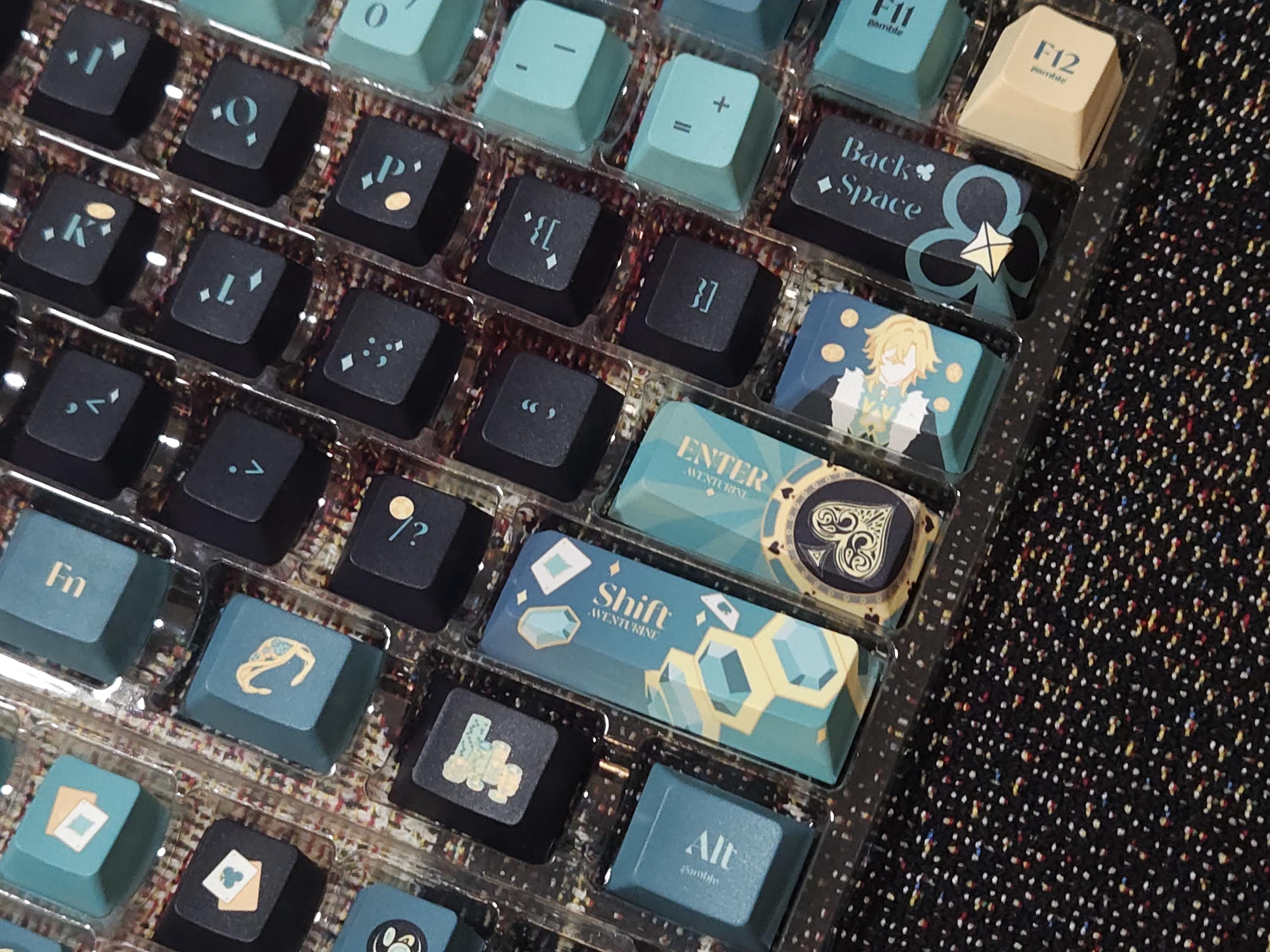 This keycap set takes inspiration from everyone's favourite gambler in Honkai: Star Rail, Aventurine. The set comes in single-shot, thick PBT and the standard Cherry Profile. It includes all the normal typing keys, number keys, function row keys, numpad keys, arrow keys, one spacebar in the standard 6.25u length, editing keys and some miscellaneous replacement keys with different designs.
