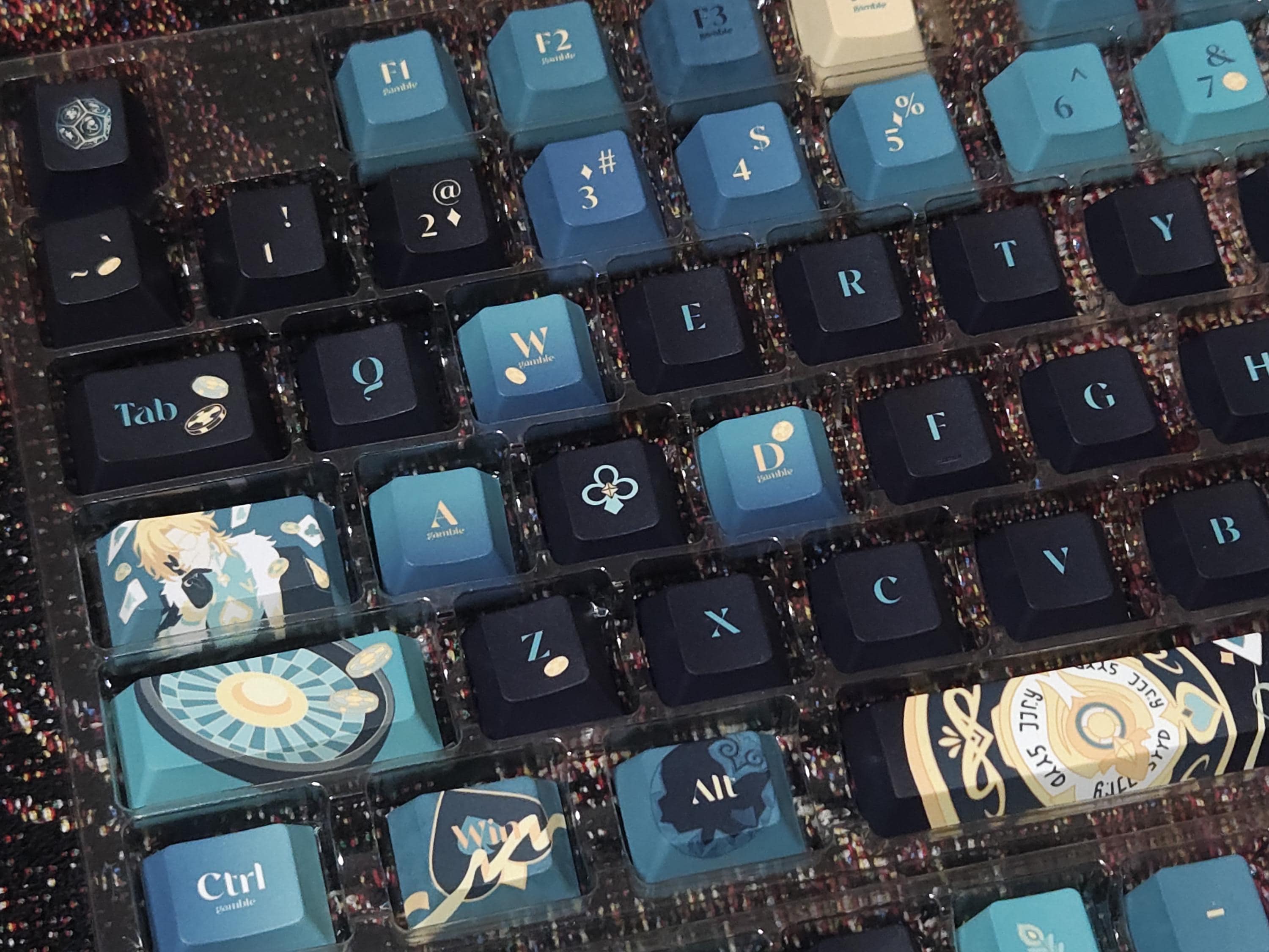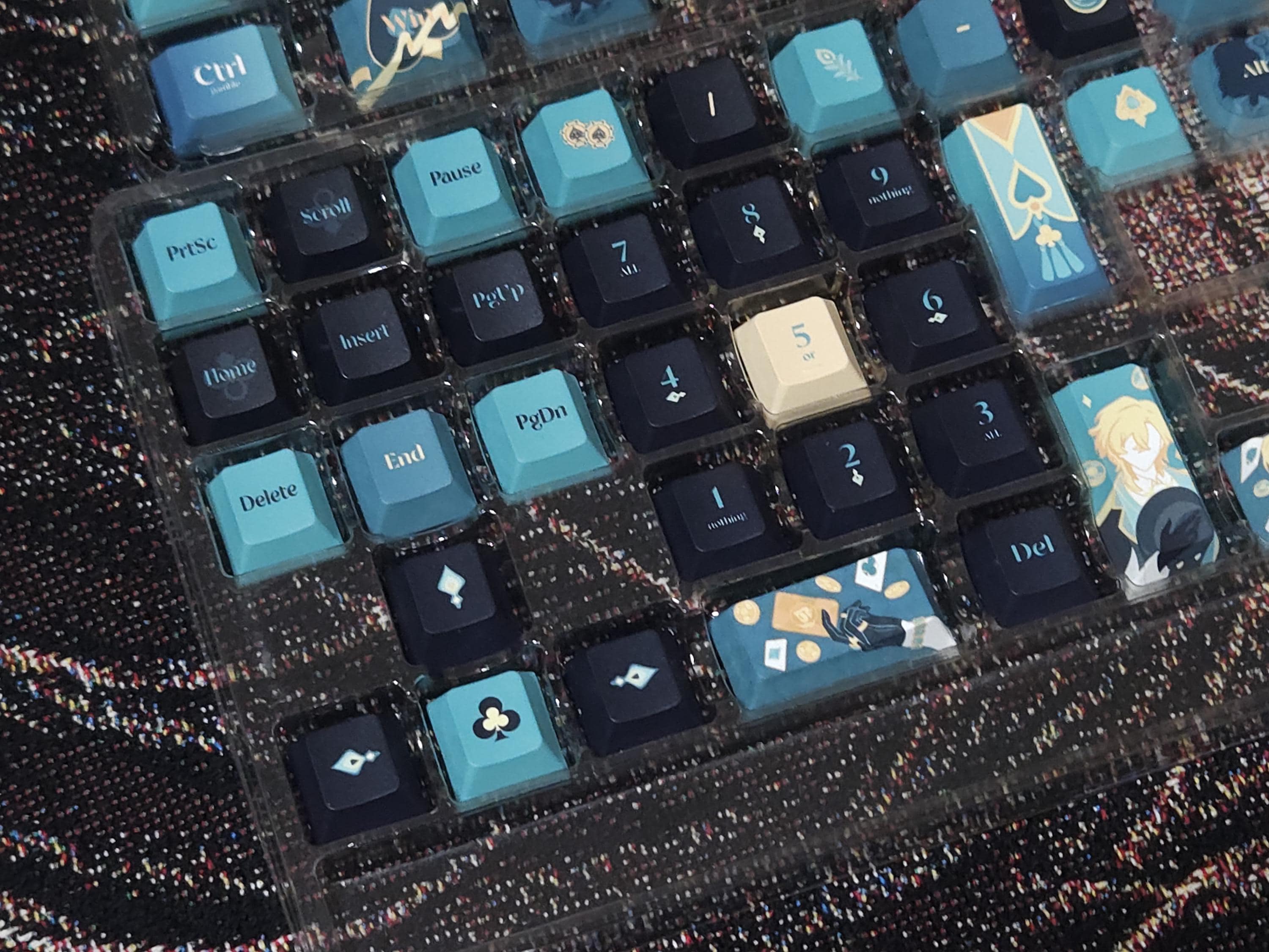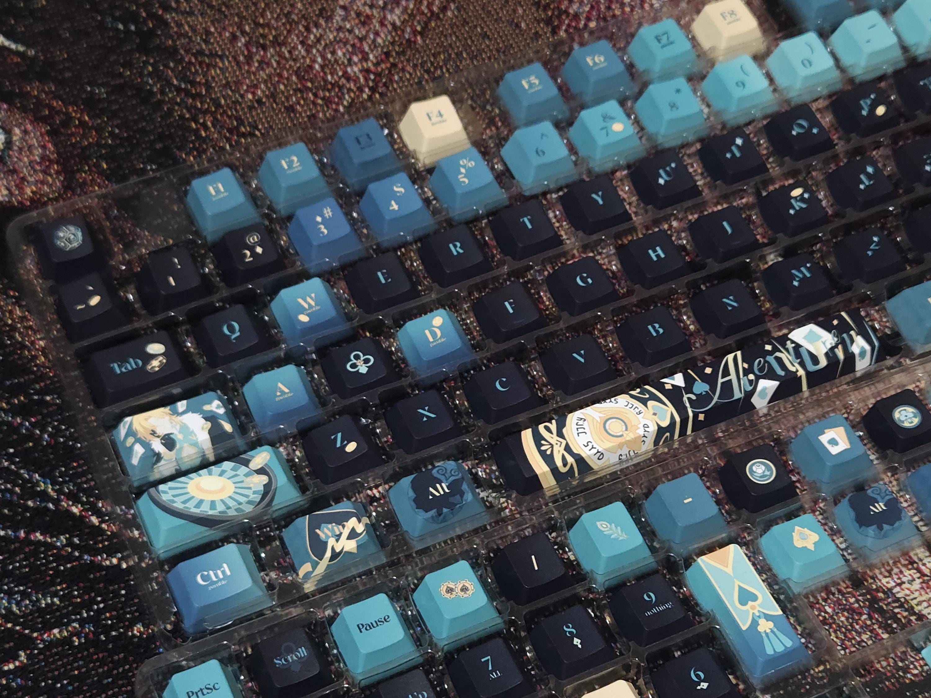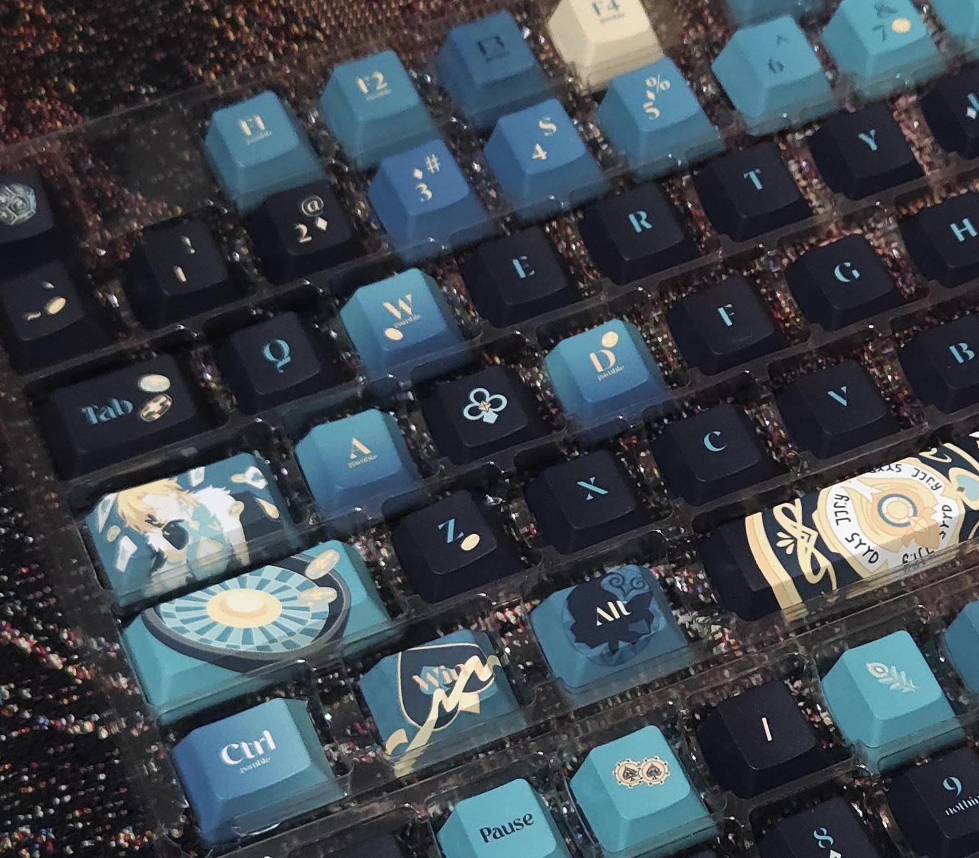 This keycap set takes inspiration from everyone's favourite gambler in Honkai: Star Rail, Aventurine. The set comes in single-shot, thick PBT and the standard Cherry Profile. It includes all the normal typing keys, number keys, function row keys, numpad keys, arrow keys, one spacebar in the standard 6.25u length, editing keys and some miscellaneous replacement keys with different designs.
