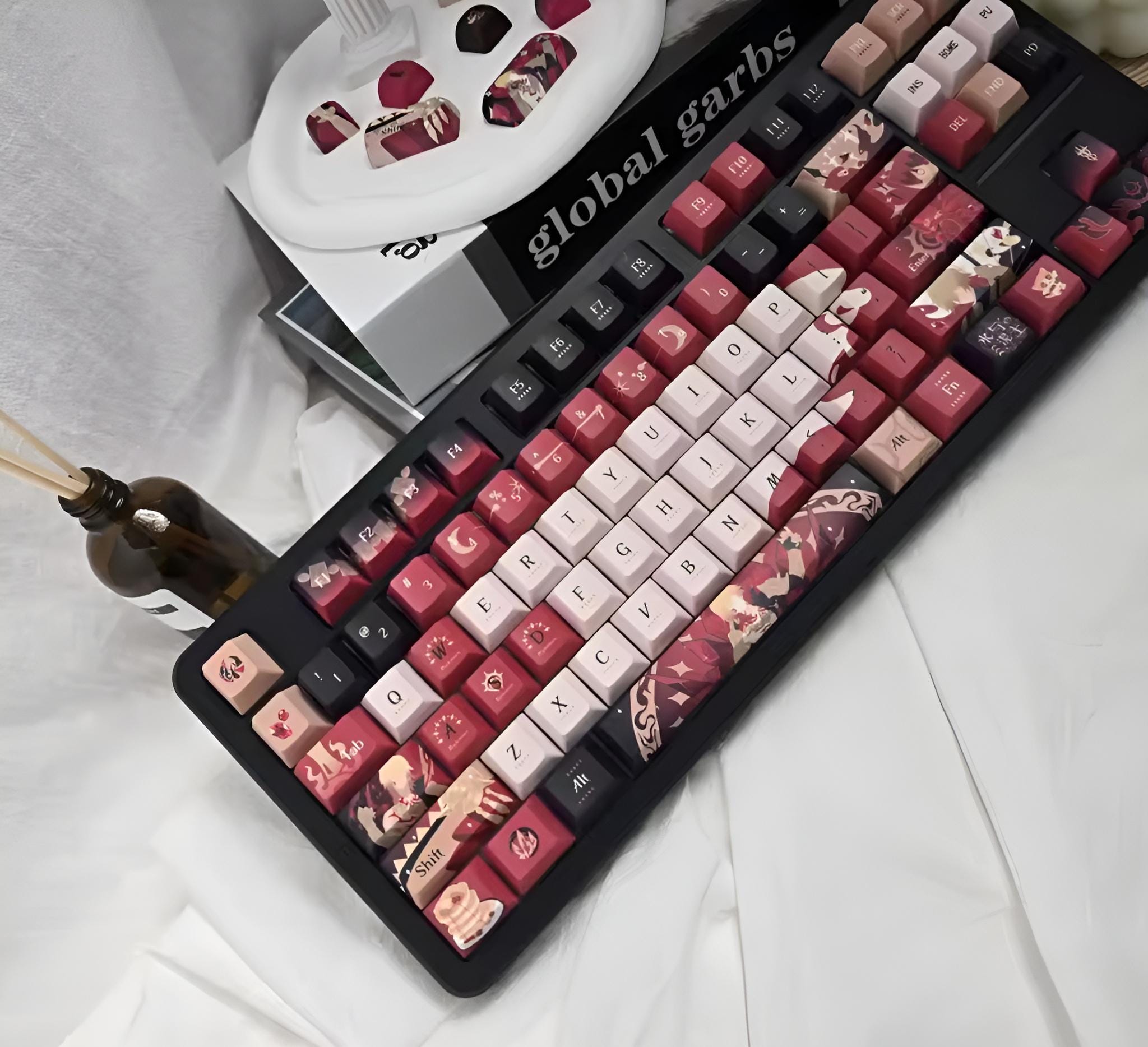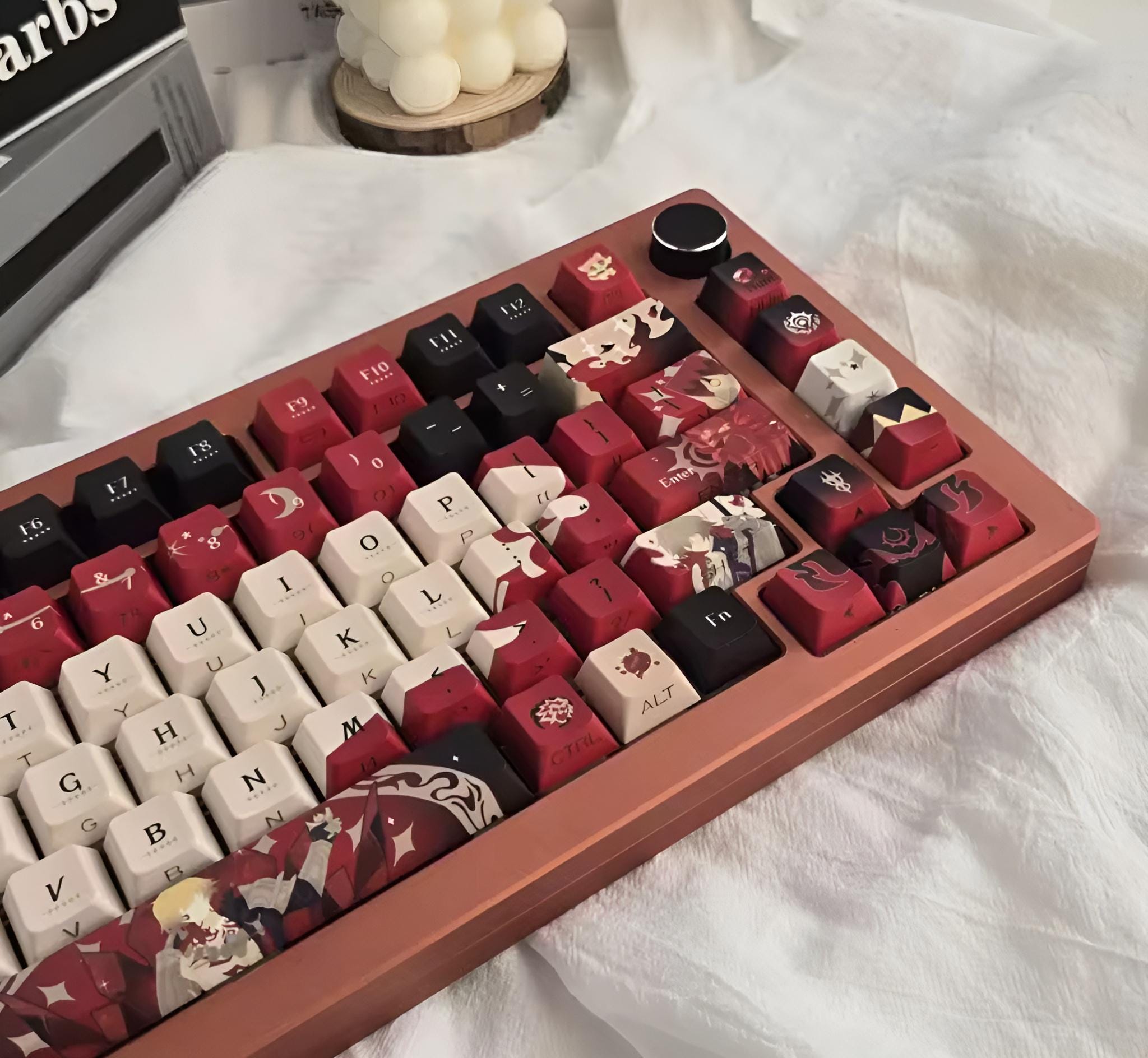 Inspired by Mydeimos from Honkai: Star Rail, this keycap set uses his iconic crimson, black and orange colour palette. It comes in the standard Cherry Profile and single-shot, thick PBT plastic. The set features the normal typing keys, function row, numpad keys, editing keys and one standard 6.25u spacebar (which will fit most keyboards).